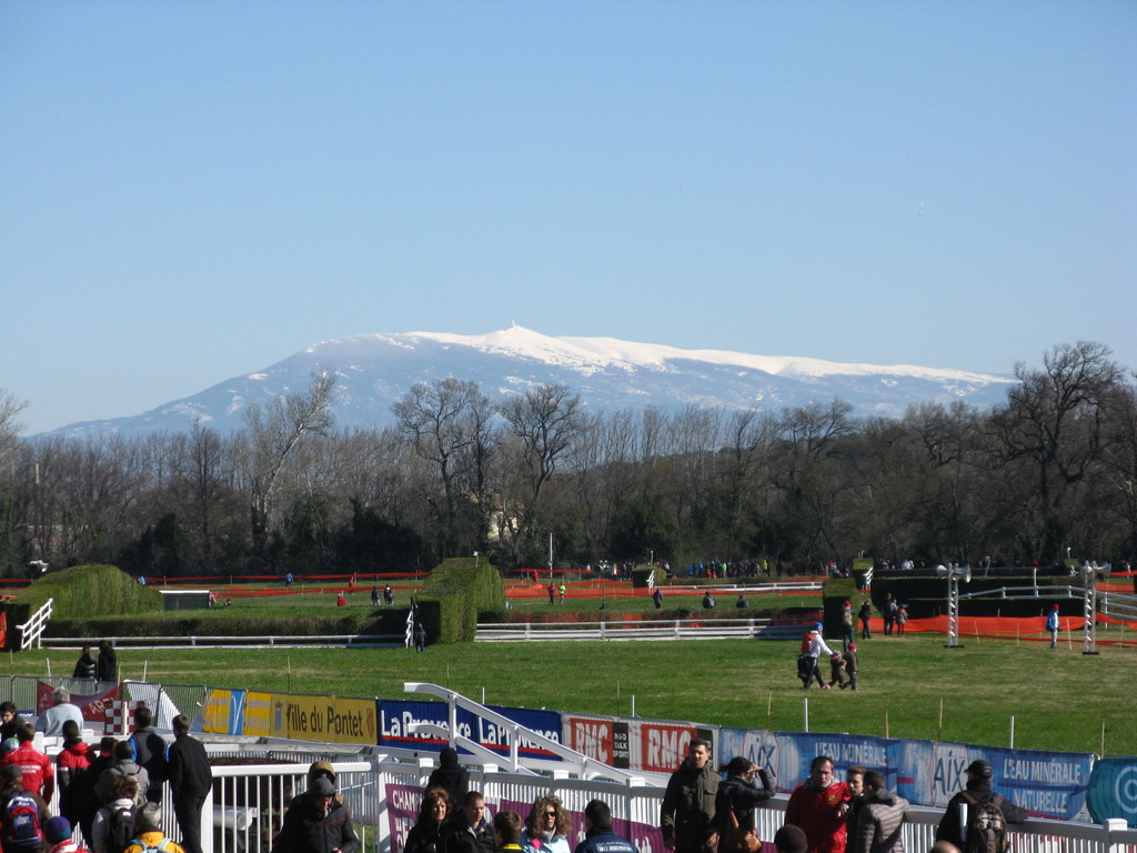 C'est sous un soleil radieux mais bien venté ( mistral ) , que se sont déroulés ces France de cross , avec en arrière plan le Mont Ventoux enneigé.